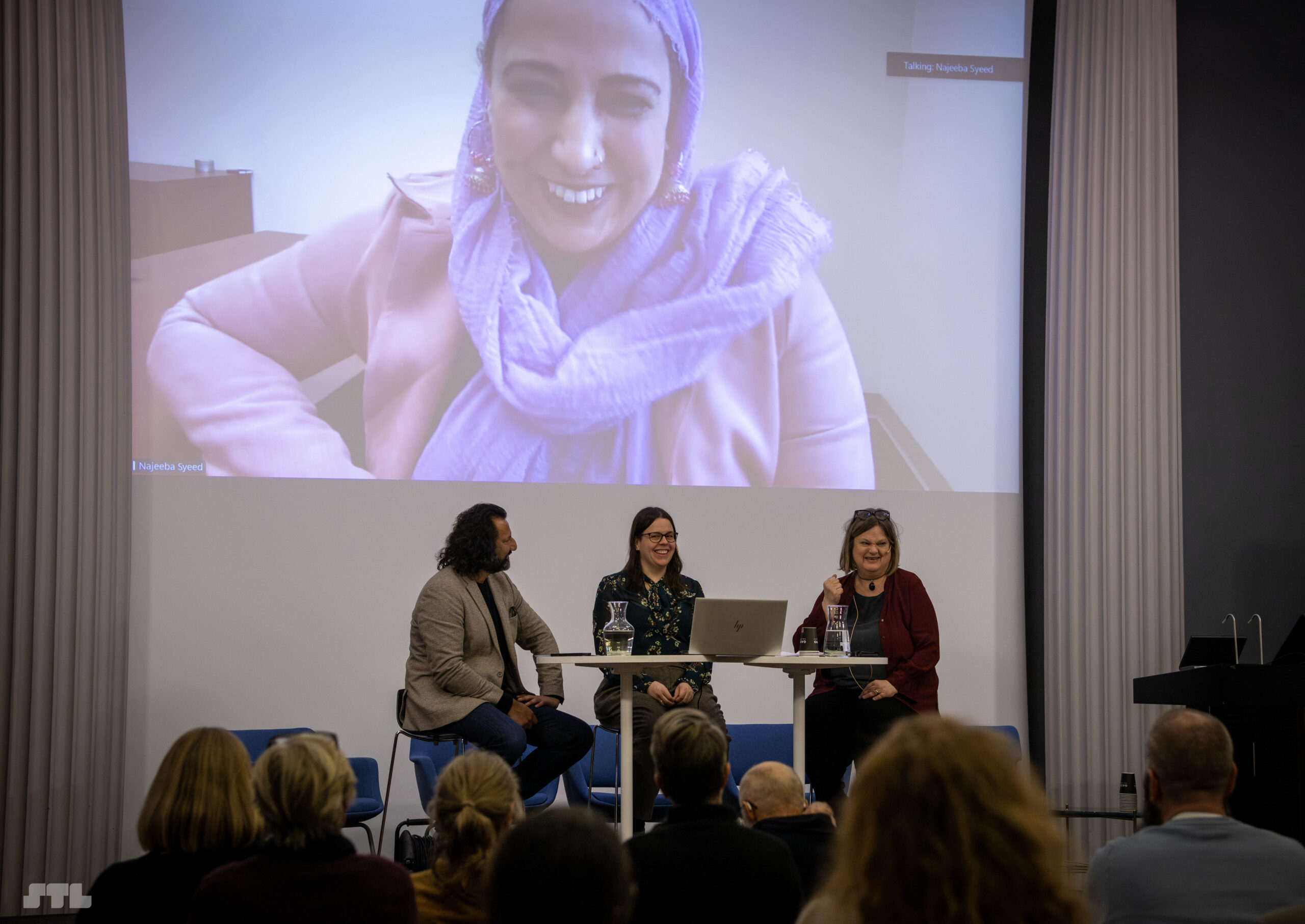 I kveldens første panel på scenen i Domus Bibliotheca satt Allison Murray og Anne Hege Grung, henholdsvis førsteamanuensis og professor ved Teologisk Fakultet. På videoskjerm fra USA deltok Dr. Najeeba Syeed fra Interfaith Institute ved universitetet i Augsburg, Minnesota. Kveldens samtaler ble ledet av journalist og forfatter Kadafi Zaman.